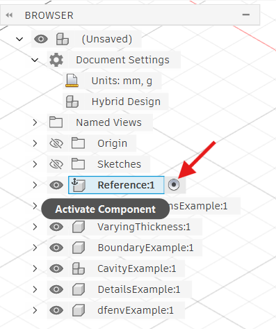 SphereneFUSION treats each component as an individual Spherene project. Therefore, before using Spherene in Fusion, ensure that the envelope geometry of interest is placed inside a component, and activate the corresponding component by clicking the dot next to the component name.